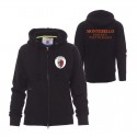 Felpa da uomo, zip intera SBS coperta, in plastica con doppio cursore in metallo, cappuccio con due cuciture, coulisse bianca in corda con cuciture in tinta con la felpa e anelle in metallo, manica raglan, tasche a marsupio con taschino con zip, polsini e vita in costina elasticizzata. Cuciture rinforzate.
