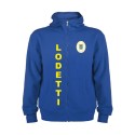Felpa stile casual con cappuccio. Collo altto e cerniera lunga. Particolari in costina intorno a cappuccio e tasca. Tasca stile canguro. Polsini e girovita in costina 2x2 con elastane.